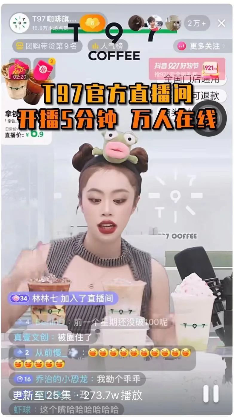 T97咖啡旗艦店女主播用唱Rap的方式賣咖啡,伴隨著魔性的Bgm,直播間流量瘋狂上漲,一躍成為本地生活賽道現象級直播間。